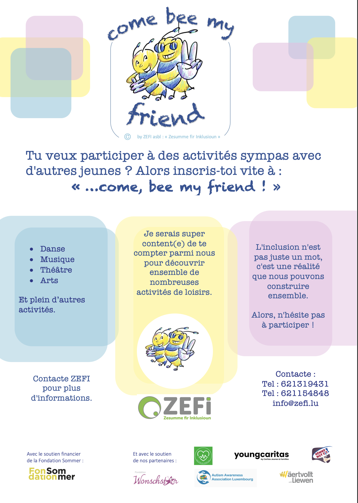 „ZEFI asbl – Zesumme fir Inklusioun“ ( Ensemble pour l’Inclusion ) engagiert sich für die Inklusion und Teilnahme von Kindern, Jugendlichen und Menschen mit besonderen Bedürfnissen oder einer Behinderung vom Kinderhort über die Schule, Transport, Freizeit, Sport und Fortbildung bis zum Arbeitsmarkt.
